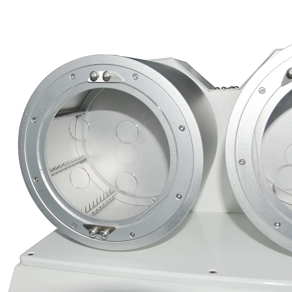 Description: The TF221 Bean Bag Snag Tester evaluates the snagging and picking resistance of knitted and woven fabrics by tumbling fabric pillows containing a weighted bean bag within two separate test cylinders. The tester features eight pinned bars per cylinder, rotating at 20 RPM for 100 revolutions, controlled by a predetermined electronic counter.